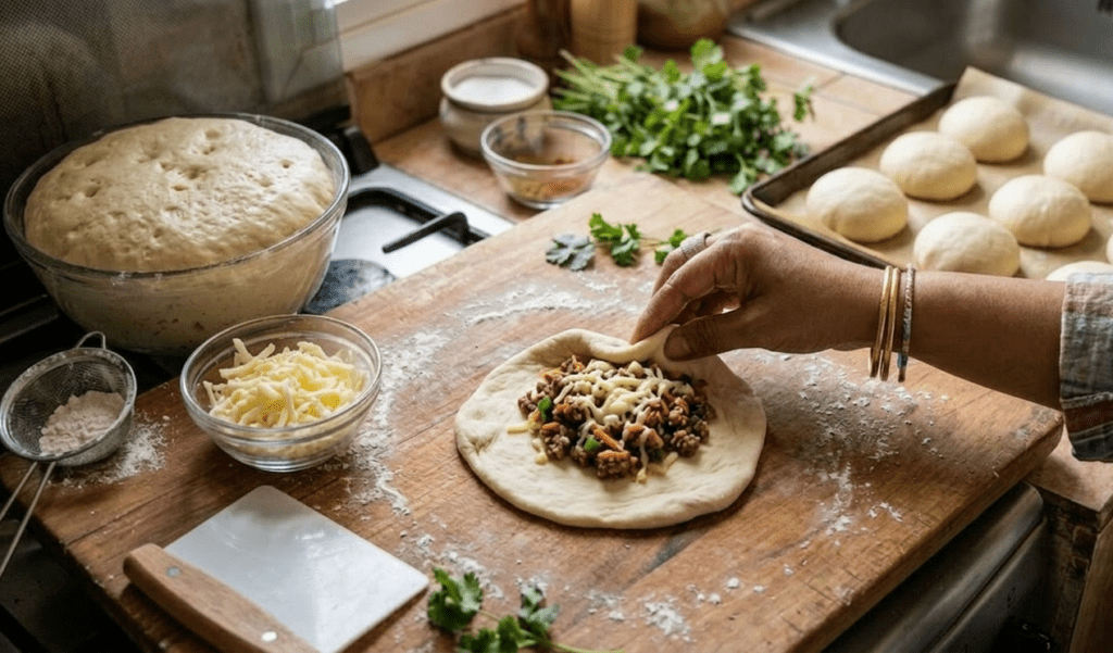 Mix the flour 🥣, milk 🥛, and yeast 🧬 until you have a soft, elastic dough. Let it rise for 45 minutes. Divide into small balls. Flatten each ball, place a generous spoonful of the filling 🥩 and cheese 🧀 in the center, and pinch the edges together to seal it into a neat round roll.