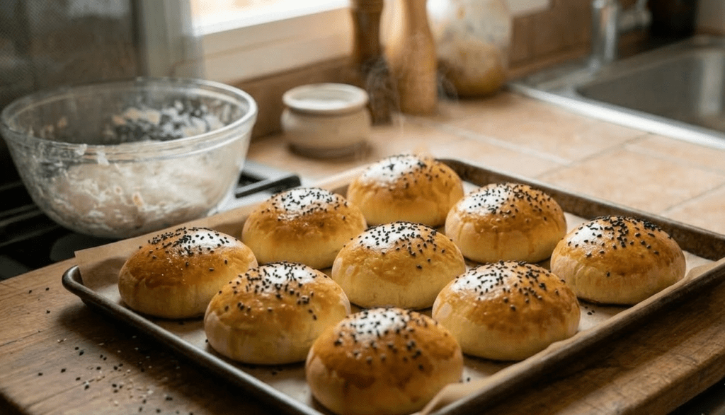 Place the rolls on a baking tray with the seam side down. Flatten them slightly and let them rest for 15 minutes. Brush the tops with egg yolk 🎨 and sprinkle with Nigella seeds 🥨. Bake at 190°C for 20-25 minutes until they are beautifully golden and fluffy.