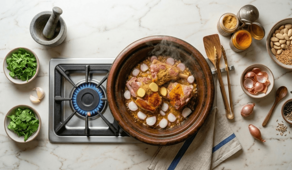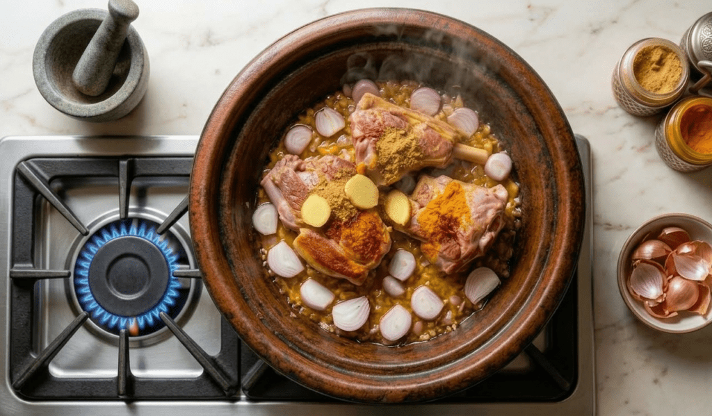 βIn a heavy-bottomed Tagine or pot, sautΓ© the chopped onions and garlic in olive oil and smen. Add the meat and sear it on all sides until it takes on a golden color. Stir in the ginger, turmeric, and saffron. Let the spices toast slightly with the meat to release their full aroma.