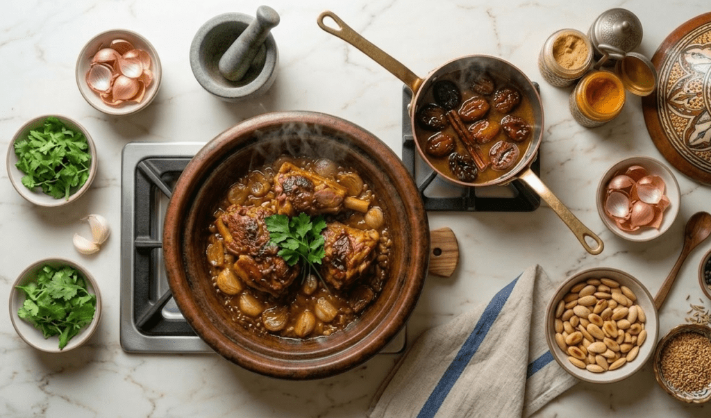 This iconic dish is the star of Moroccan celebrations. It features tender, slow-cooked meat in a golden ginger and saffron broth, topped with honey-glazed prunes and crunchy toasted almonds.